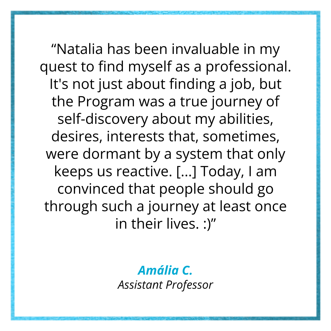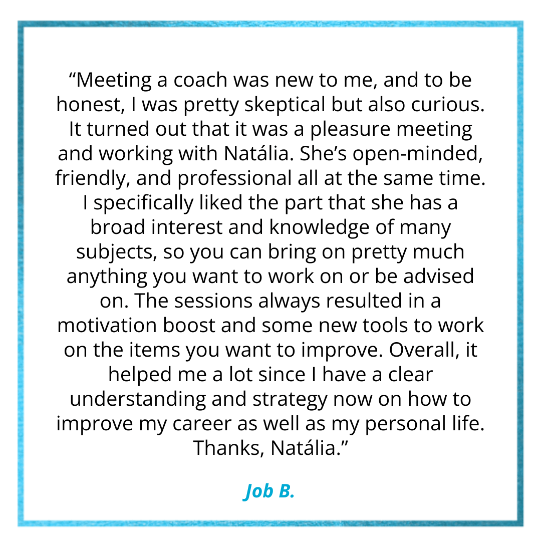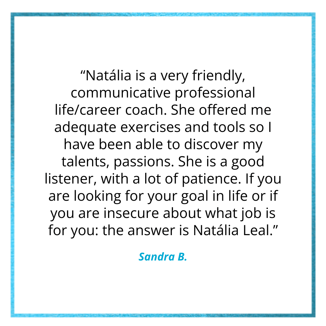 Through individual and group coaching and training, Natália Leal | Coach & Trainer supports internationally-minded individuals and teams – including expats and their partners, executives, academics and graduate students abroad – navigate their big and small career & life transitions, so you can have the clarity, mindset and strategy you need to be successful and happy, without all the frustration, stress and worry it so often implies.