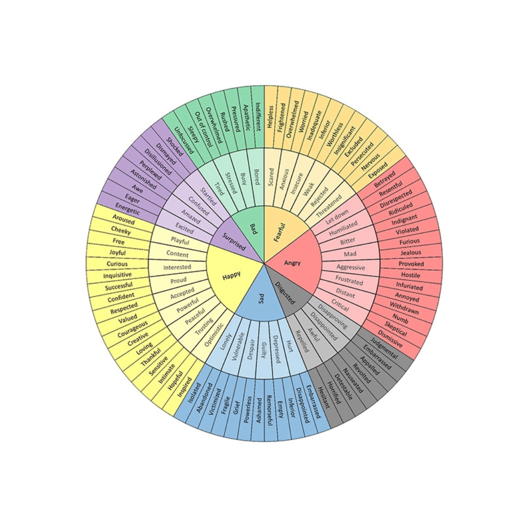 The next time you are looking for words to express something, try to identify what it is, for example, starting from the centre of the wheel (your core emotion) and moving outwards as you can find other words that resonate with you and specify it better. [You can also start from the outside; there is no one way to do it!]