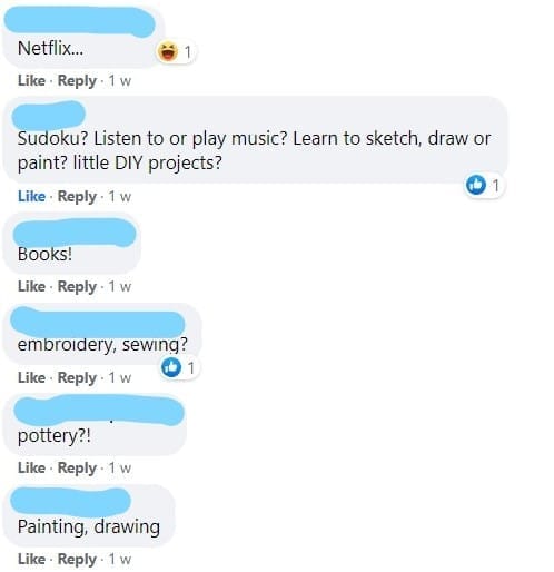 During this period, I have felt uncomfortable (or was not even allowed) to do some of my normal activities, so I have been trying a few new ideas as I continue to search for more. So, last week I made a post on Facebook that caught more attention than usual. I was simply struggling to find ideas about what I (and you) can do that is interesting and/or fun, alone, at home, and repeatable (more than once, regularly)? So I decided to ask my friends... and they replied (check the images below)!